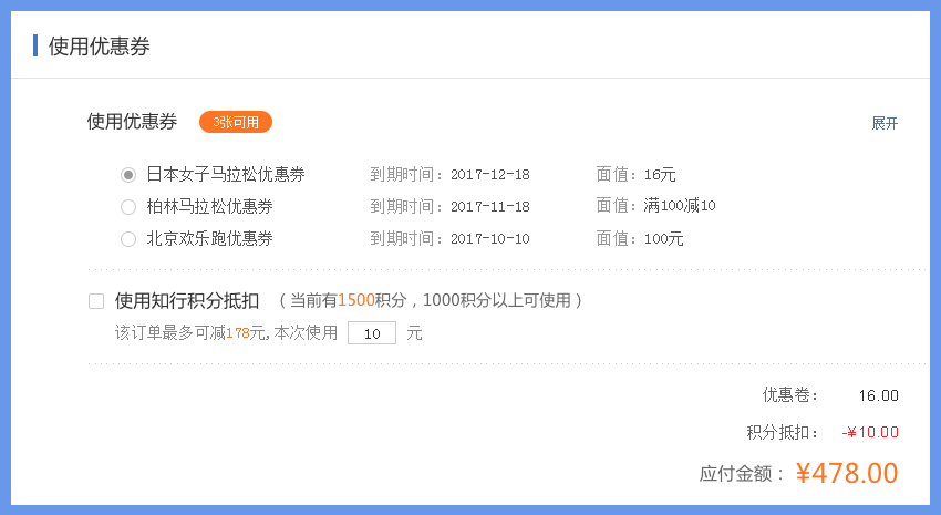 在报名支付费用时,可选择积分抵扣,积分抵扣金额的比例为100:1(即100积分=1元)